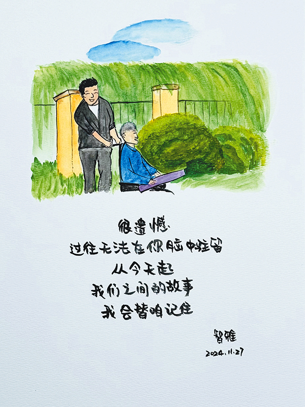 當陳智雅和護理員問其緣由時,他回答說:“雖然我爸爸不認識我了,但是我能陪著他老去。這樣的話,我的生命中就會多出很多跟爸爸共同的回憶。”