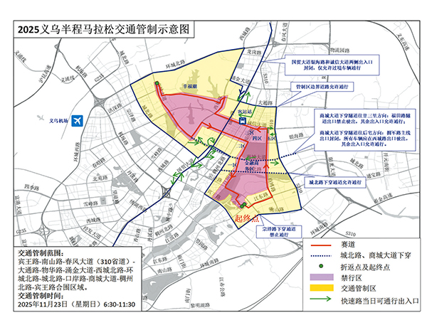 11月23日(星期日)6:30至11:30,對賓王路—南山路—春風(fēng)大道(310省道)—大通路—物華路—涌金大道—西城北路—環(huán)城北路—城北路—口岸路—商城大道—稠州北路—賓王路合圍區(qū)域(不含以上道路)進(jìn)行臨時交通管制。除持有通行證車輛外,其余車輛禁止進(jìn)入。