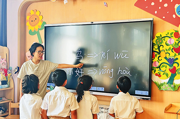 老師播放義烏方言的視頻,孩子們爭先恐后地跟讀,這是在群星幼兒園方言課堂上常見的令人會心一笑的場景。這樣的改變始于去年10月,李媛婷牽頭開設了義烏方言課程?!耙婚_始,我只是想讓班里的義烏人和新義烏人子女更好地感受當?shù)胤窖?,沒想到外籍家長們的反應也很熱烈?!敝螅屯乱黄馉I造沉浸式教學氛圍:入園問候用方言,游戲指令用方言,甚至就餐時都會教孩子們用方言說“吃飯”“午飯”“慢慢吃”等常用詞。