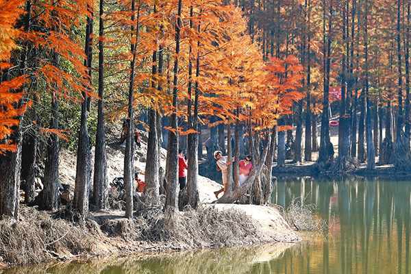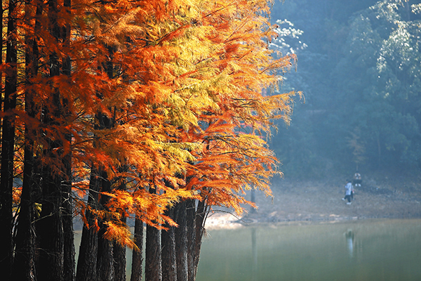 走進雅治街村的朝陽水庫邊,百余株水杉整齊排列,高達三四十米的樹干筆直挺拔,枝條層層舒展如塔形,細密的葉子在季節(jié)流轉中完成翠綠、金黃、橘紅的絕美漸變?!拔液图胰艘黄饋磉@里露營,水杉黃紅相間的樣子十分好看,隨手一拍就是一幅壁紙級的照片?!笔忻裰煊贻嫒滩蛔≠潎@道。據(jù)了解,這幅“一半山景一半湖色”的美景將持續(xù)至12月中旬,從深秋的青黃交錯到初冬的緋紅一片,不同時段能領略到不一樣的韻味。