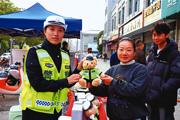 交警為答對(duì)交通安全問題的群眾送上交警小熊