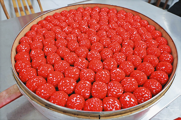 將糯米粉加溫水?dāng)嚢?,反?fù)揉壓成光滑面團,再精準(zhǔn)分劑、裹入飽滿餡料,最后滾上紅曲染就的米粒、送入蒸籠。大約10分鐘后,一籠籠紅潤油亮的紅粿便蒸騰出鍋。趁熱咬上一口,米香滿溢,芝麻核桃餡伴著豬油的潤香,這口香甜,正是代代相傳的鄉(xiāng)土記憶,也是許多人心中無法替代的老味道。