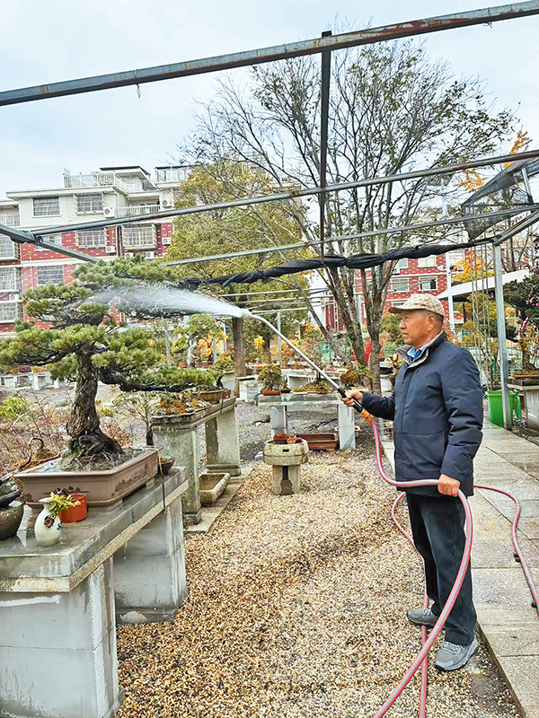 12月11日下午2時(shí),和煦陽(yáng)光傾灑在流里塘村占地2畝的“玄松居”盆景園里,也照耀在主理人吳三團(tuán)的臉上?!梆B(yǎng)松基本功是澆水。水要澆透,但不能太多,就像喂小孩一樣,得看它的‘胃口’。”他一邊打理園子,一邊細(xì)致地向圍攏過(guò)來(lái)的幾位盆景愛(ài)好者,示范如何判斷盆景的需水量。這樣的場(chǎng)景,已成為吳三團(tuán)的日常。
