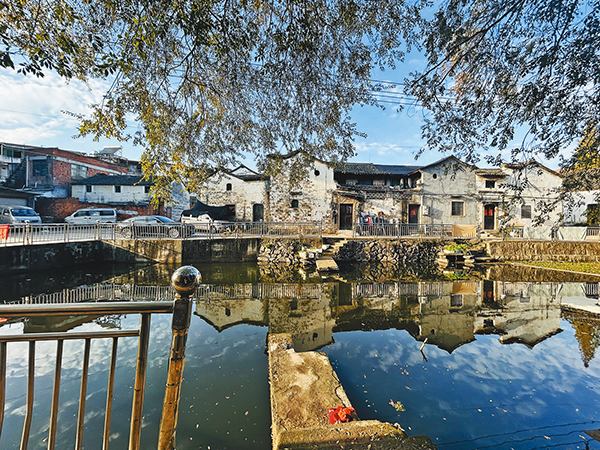 告別老人后,我們又參觀了江灣村文化禮堂,從邊門出來后就看到了一口塘?!斑@個是照鏡塘,聽說早先時候有個家境富裕的太婆嫁到我們村,發(fā)現(xiàn)房子旁邊沒有水塘有礙風水,于是就拿出部分嫁妝請人挖了這口塘?!蓖鹾闅v的講解,立刻為這口普通的池塘增添了“光暈”。