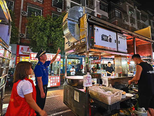 執(zhí)法隊員現(xiàn)場查看夜市餐飲商戶油煙凈化設施運行情況。